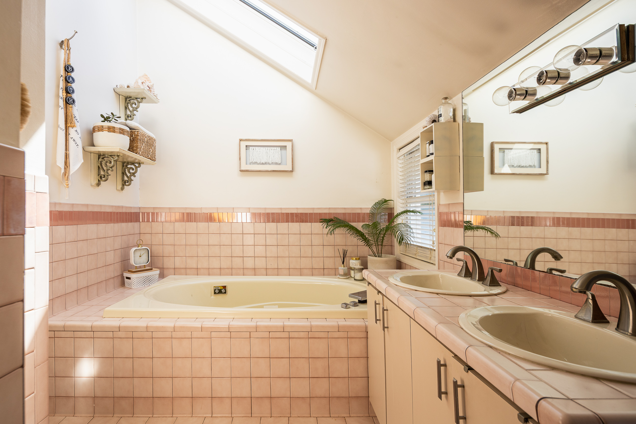 The primary suite offers a serene retreat with cathedral ceilings, a dressing room, sliding doors to a covered balcony, and a luxurious bath with jacuzzi, separate shower, double vanity, and skylight.