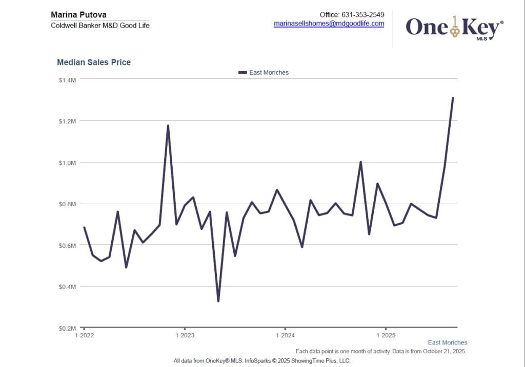 Current market data underscore this dynamic. According to one reputable source, the median sold home price in East Moriches was around $790,000 in June 2025 — a gain of about 6% from the prior year. On another measurement, a recent dataset shows the median sale price at $1,308,750, marking a dramatic year-over-year rise. Redfin